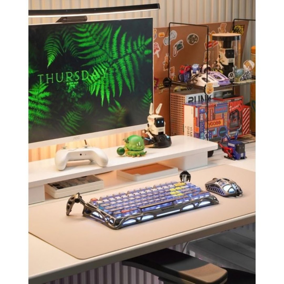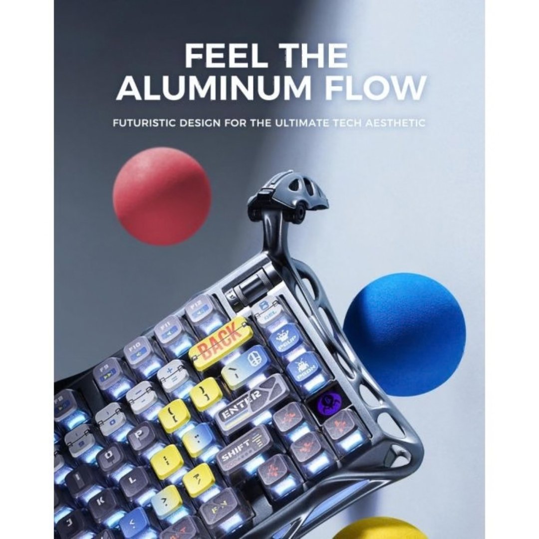 A premium 75% mechanical keyboard with a futuristic aluminium frame, Kailh Speedy Mint linear switches, and dual RGB lighting with PBT pudding keycaps. Features an 8000mAh battery, tri-mode connectivity (Wired, Bluetooth, 2.4GHz), and a gasket mount design for smooth, quiet, and responsive typing.
