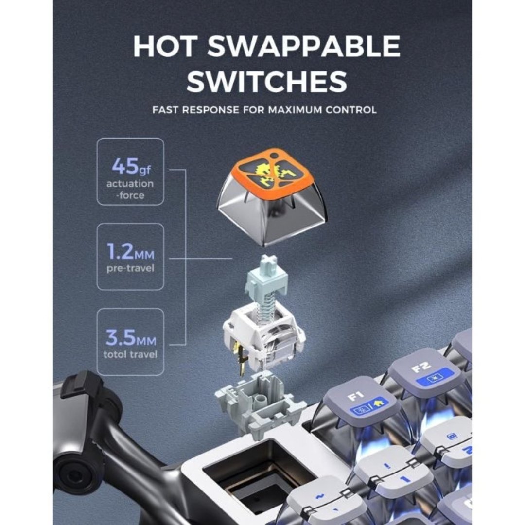 • Futuristic design and premium construction quality – The Mercury K1 Pro impresses with a unique design and a robust aluminium alloy frame that combines durability and portability. The skeleton design not only provides an impressive look, but also stabilizes every key press, making it the perfect blend of art and functionality.